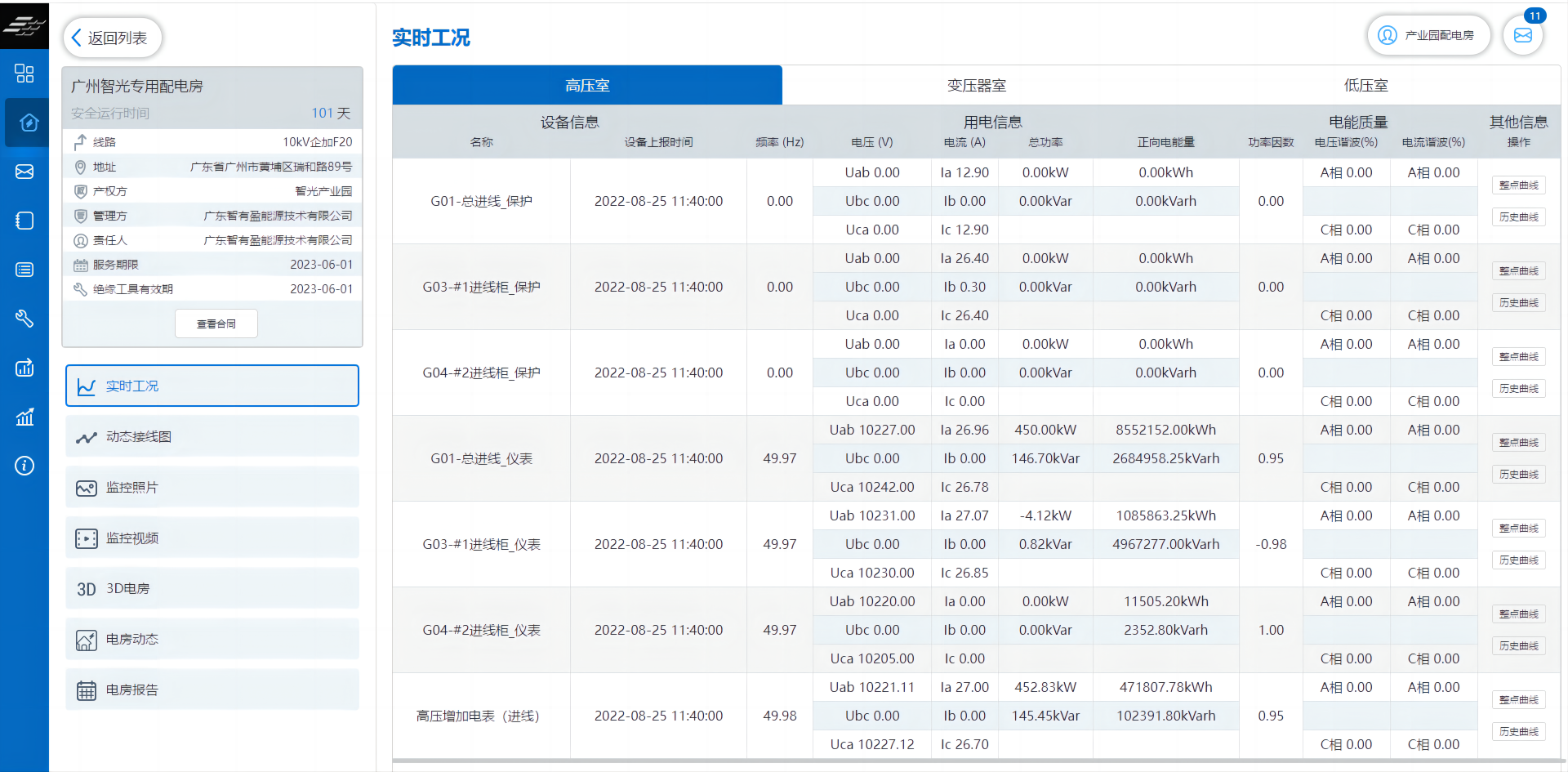 通過設(shè)備列表、動態(tài)接線圖等界面查看饋線及用電設(shè)備的實(shí)時運(yùn)行狀況、歷史數(shù)據(jù)、監(jiān)控照片、監(jiān)控視頻等。用電數(shù)據(jù)不僅包括了常用的電壓、電流、功率、用電量等數(shù)據(jù),還能查看到諸如有功需量、諧波含量等與經(jīng)濟(jì)用電、電能質(zhì)量水平相關(guān)的數(shù)據(jù)項目。